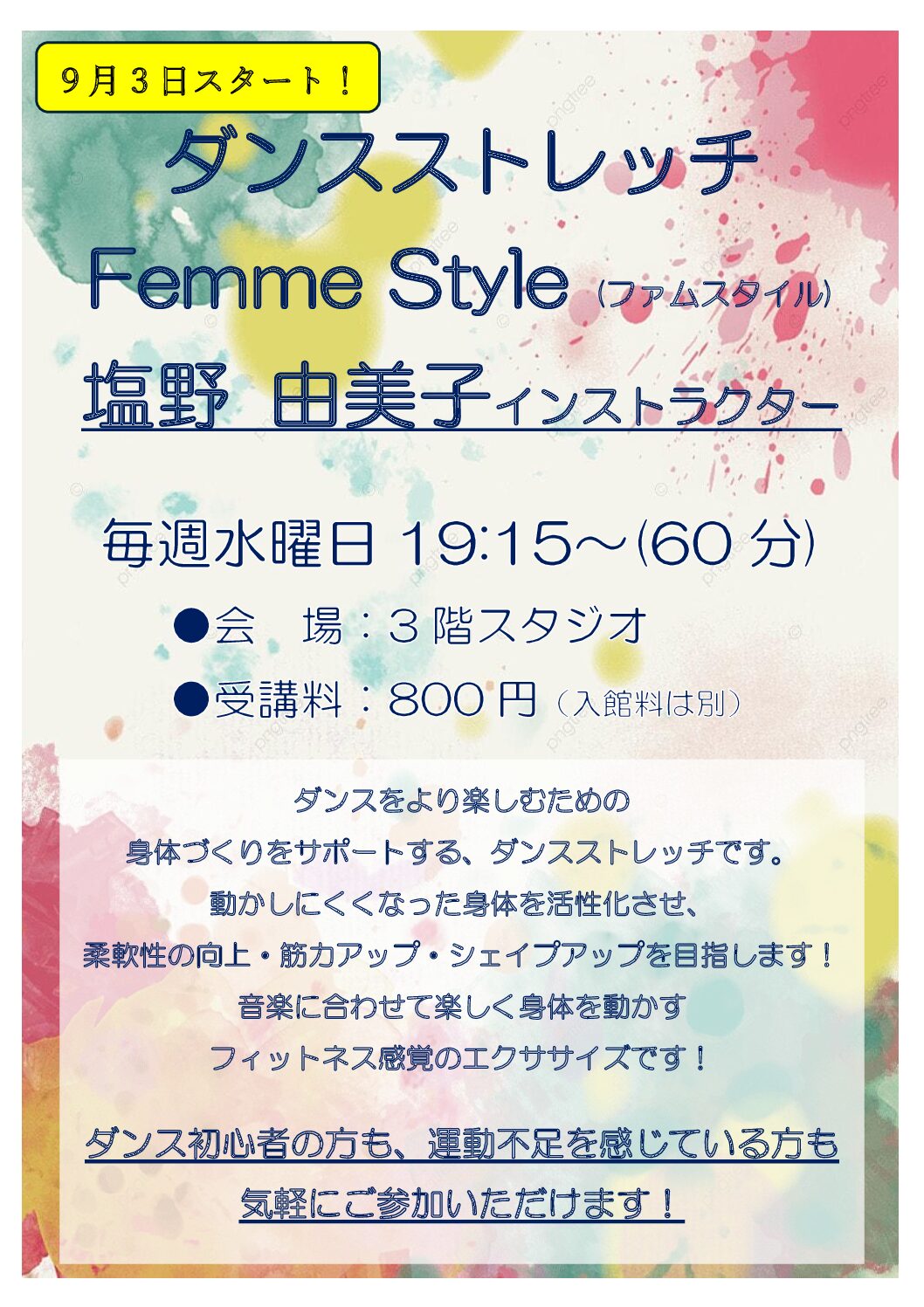 ●プールレッスン 変更はありません ●スタジオレッスン 11月5日(水) 19:15~ ダンスストレッチFem…