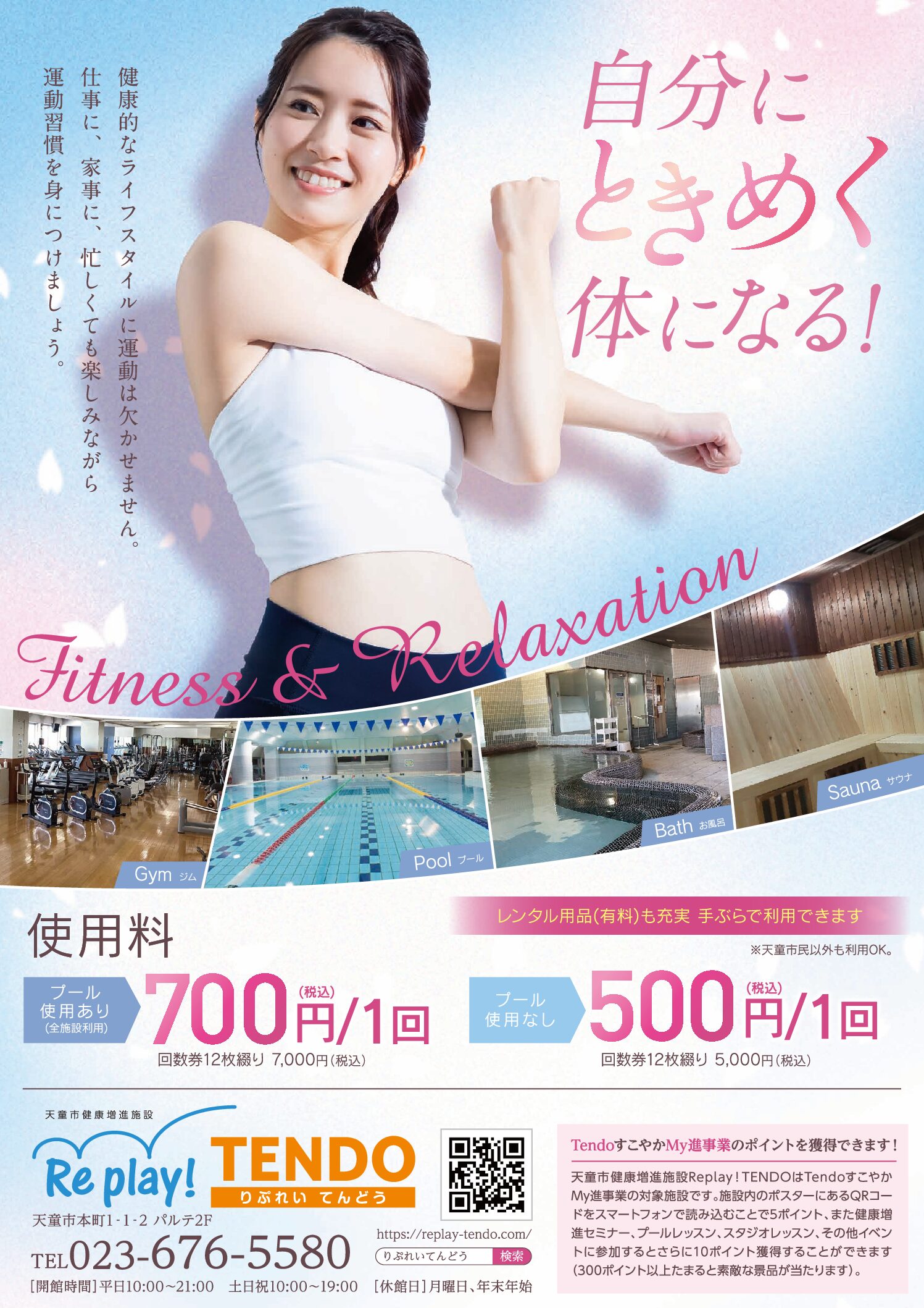 愛称のReplay! TENDO(りぷれい てんどう)には、施設を利用して中高年の方が再び運動するようにと、施設が中高年の方の体力づくりの場になるようにという思いが込められています。