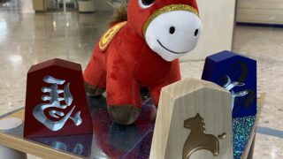 佐藤工芸さんの飾り駒「左馬」「飛翔午駒」を入口に飾っています。 ぜひご覧になってください。